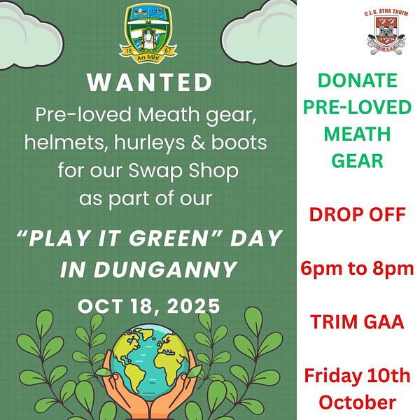👕 Refresh your sports wardrobe at the sports gear clothes swap—exchange your pre-loved gear for something new-to-you. If you can't make the event on Saturday CLG Átha Troim are holding a drop off evening if you have any pre-loved gear to donate.