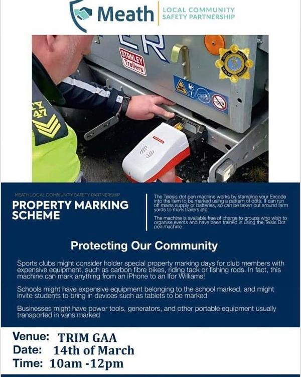 A Property Marking Event will take place at Trim GAA this Saturday, 14th March from 10am – 12pm, organised by Meath Local Community Safety Partnership in partnership with Trim Community Gardaí.