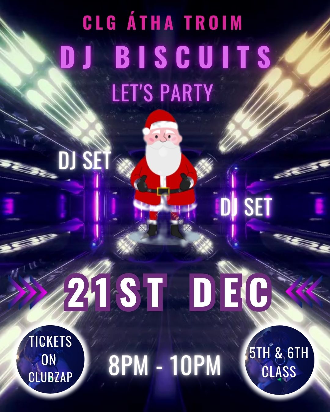 SPOT PRIZES FOR CHRISTMAS THEMED OUTFITS It’s Disco time with DJ Biscuits! Trim GAA from 8pm - 9:50pm Suitable for 5th and 6th class €12 per ticket